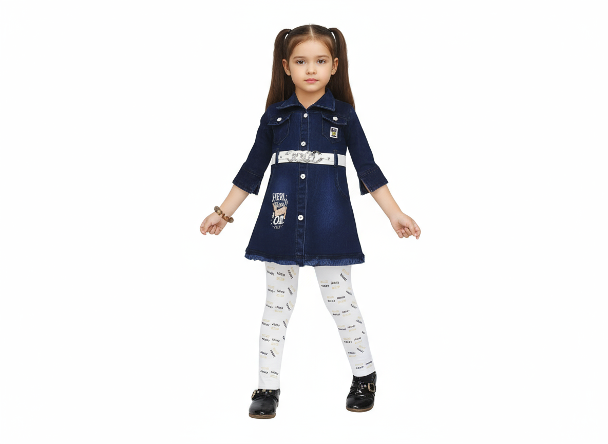 Girls Denim Shirt Dress with White Printed Leggings | Stylish Kids Western Outfit with Belt – Age 2-3 Years | Trendy Casual Wear for Girls