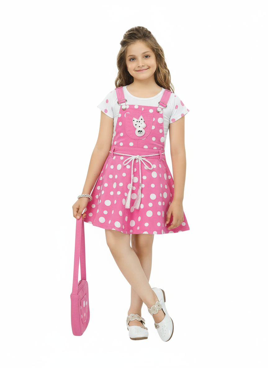 • 👗 Trendy Dungaree Set: Includes pink polka dot frock, white top, and matching sling bag for a coordinated look.